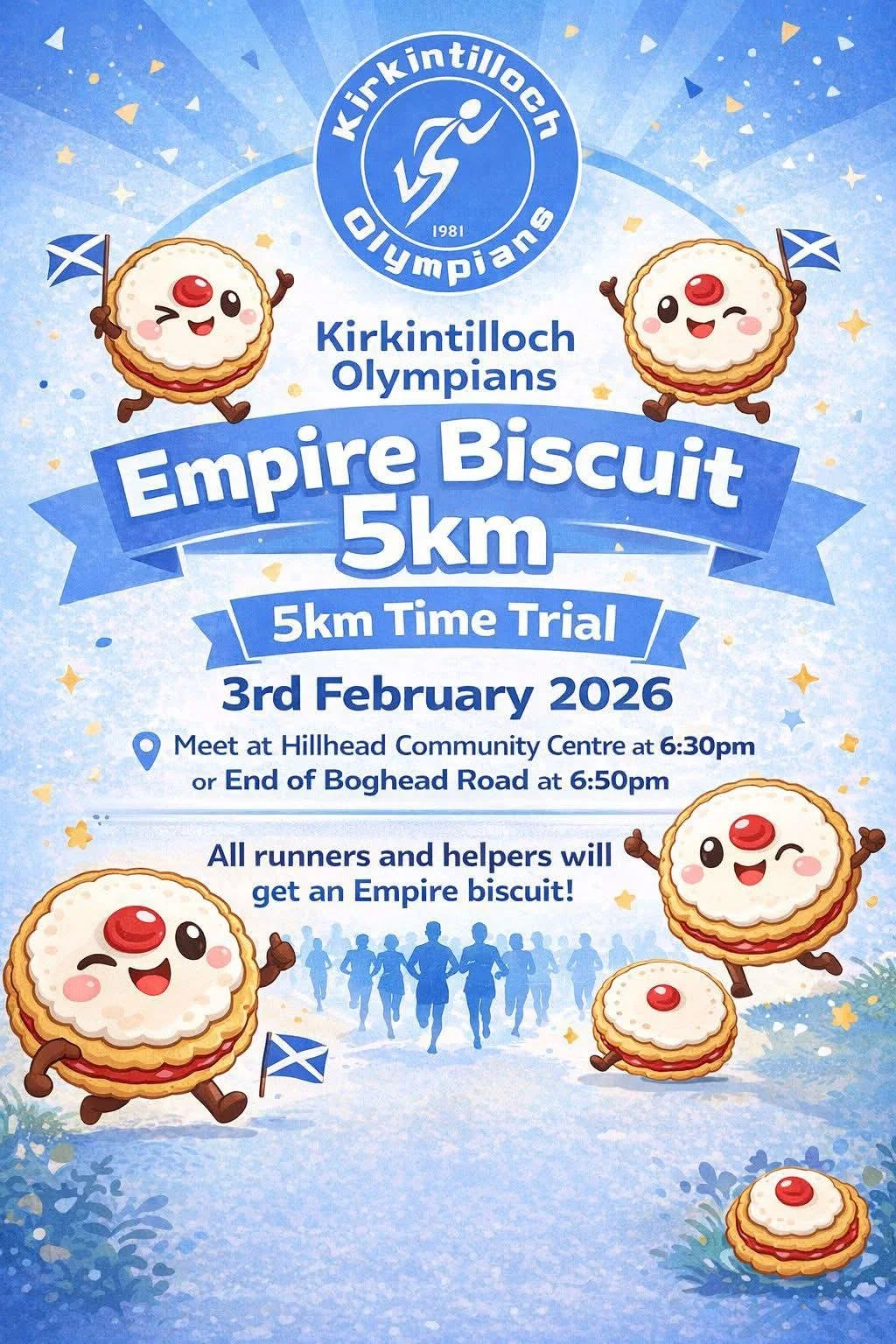 Every first Tuesday of the month the Kirkintilloch Olympians meet for a time trial. The distance is just over 5km, with different routes for summer and winter. Using the same route each time allows runners to test themselves and gauge their fitness. Runners are set off at intervals, usually 30 seconds, and provided with an official time. This Tuesday 3rd February there is the added incentive of an Empire biscuit for all runners and helpers. All members and non-members welcome.