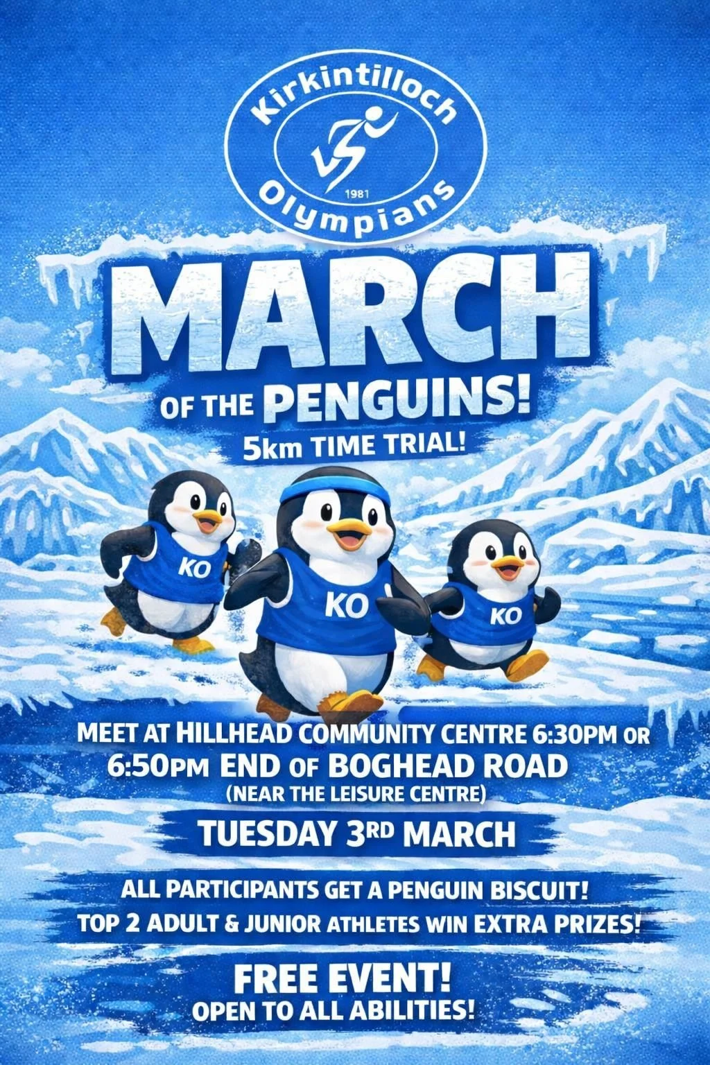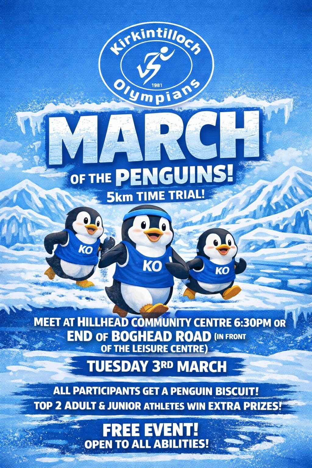 Every first Tuesday of the month the Kirkintilloch Olympians meet for a time trial. The distance is just over 5km, with different routes for summer and winter. Using the same route each time allows runners to test themselves and gauge their fitness. Runners are set off at intervals, usually 30 seconds, and provided with an official time. This Tuesday 3rd March there is the added incentive of a Penguin biscuit for all runners and helpers. All members and non-members welcome.