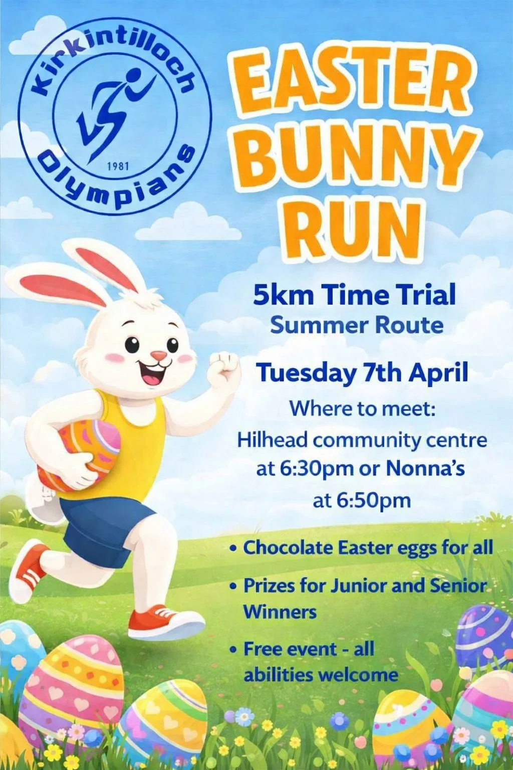 Every first Tuesday of the month the Kirkintilloch Olympians meet for a time trial. The distance is just over 5km, with different routes for summer and winter. Using the same route each time allows runners to test themselves and gauge their fitness. Runners are set off at intervals, usually 30 seconds, and provided with an official time. On Tuesday 7th April there is the added incentive of a chocolate Easter egg for all runners and helpers. All members and non-members welcome.